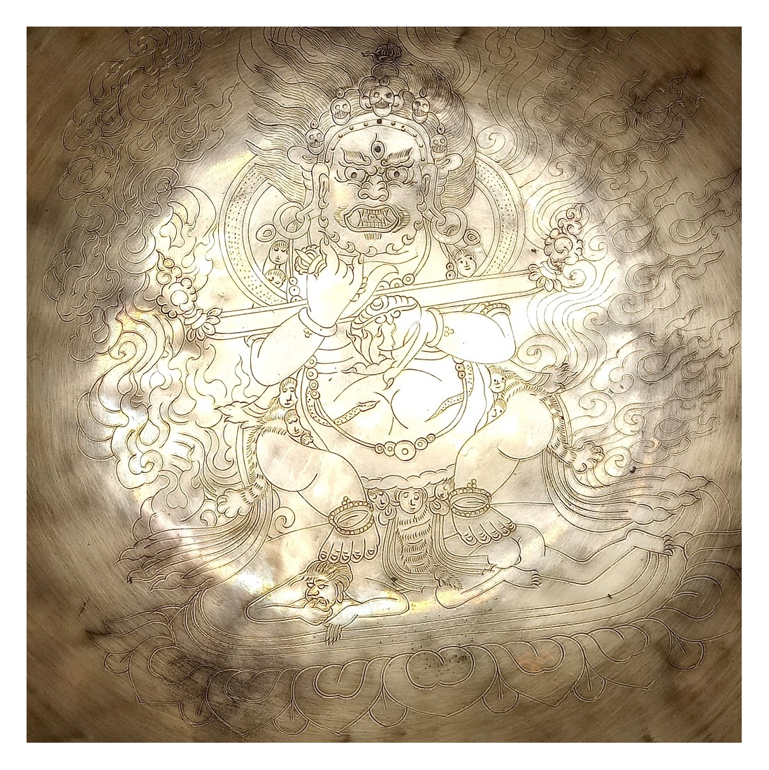 Esta pieza artesanal está decorada con la imagen de «Mahakala» grabada a cincel en su interior. Se presenta acompañada de maza de madera y piel.